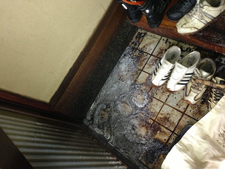 上記の写真は、お出かけしようと玄関で亡くなった方の特殊清掃の現場です。日当たりが良すぎて腐敗が進み虫と異臭が出ておりました。