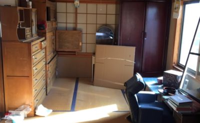 パッと写真で見ると荷物はとても少なく見えますが、タンスも高さが180センチoverで階段から下ろすのも人苦労でした。お見積もり時3t車あれば楽々積み込みできると思っておりましたが、都合4、5t分の荷物があり、手配したトラックギリギリとなりました。お家やお部屋が大きい場合(天井の高さが高い場合も)、空間が広いと家具などが小さく見えて、見積もりが甘くなります。今回はまさにそれでなんとか積み切ることができました。ご依頼様がご自身で、要るものを先に見てくださってもいたので、時間こそかかりませんでしたが、冷や汗の出る現場となりました。