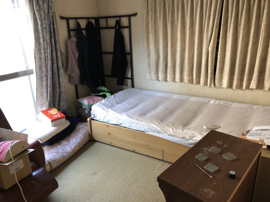 寝室です。貴重品が出るとすれば、仏間に並び一番貴重品が出やすい(経験則ですが)寝室ですが今回はご依頼者様が時間をかけてみてくれていたので、引っ掛けてあったズボンのポケットから1円が出ただけでした。今回は切手と写真とこの現金1円のみのお返しとなりました。