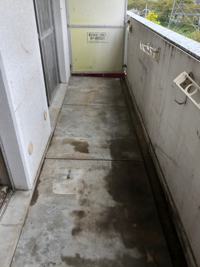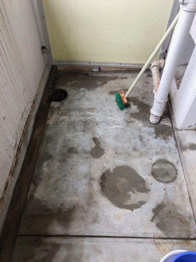 作業の仕方としては、まずベランダにある荷物を仕分け、そして梱包して行き荷物をまず退けて行きます。物置もあったの分解して撤去し物がなくなったところで一度箒がけをします。フンをできるだけ取り除いておきます。ある程度掃き掃除が終わった状態が上の写真です。そこから、洗剤を入れた水を撒きながらデッキブラシでこすります。排水溝にふんが流れて詰まらないように、タオルを詰めておきます。一通り磨いたところで、排水溝のタオルに塞き止まってるフンをすくい、もう一度水を撒きこすります。作業自体はおおよそ2時間半ぐらいでした。空き部屋になったら間違いなく、鳩が来るので、あまり意味がない掃除かもしれませんが、なるべく気持ちよくお部屋を返す努力をしております。